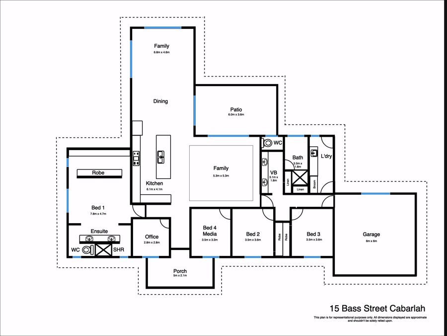 The open-plan kitchen and living area provide the light-filled beating heart of this magnificent home, with expansive windows and doors bringing the outside in and inviting residents to the rear covered patio area.